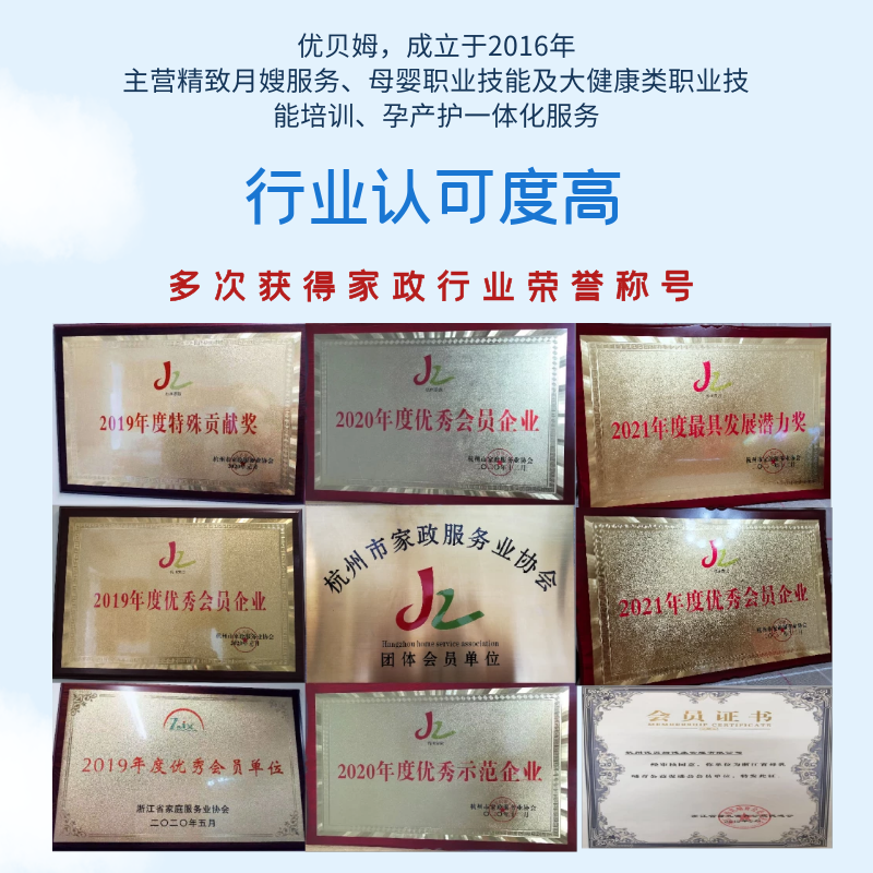 杭州優(yōu)貝姆健康管理有限公司,成立于2016年,是一家致力于打造集定制居家月嫂服務、孕產護一體化服務、母嬰健康管理培訓學校為一體的現(xiàn)代化母嬰健康管理企業(yè)。 連續(xù)多年被浙江省家政協(xié)會及杭州市家政協(xié)會評為:“優(yōu)秀會員單位”“家政示范企業(yè)”“特殊貢獻獎”等殊榮。 多次在浙江省家政技能比賽中獲得優(yōu)異成績,并代表浙江省參加“長三角家政技能大賽”并取得優(yōu)異成績。